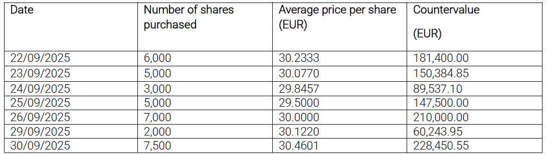 The Program ends today, with the total purchase from July 3, 2025, to September 30, 2025, of 210,905 shares (0.496% of the share capital) at an average unit price of euro 28.7168 per share, for a total value of 6,056,509.85. The Program concerned the purchase up to a maximum of 350,000 shares, corresponding to 0.824% of the issuer's share capital, for a maximum consideration of euro 10,000,000.