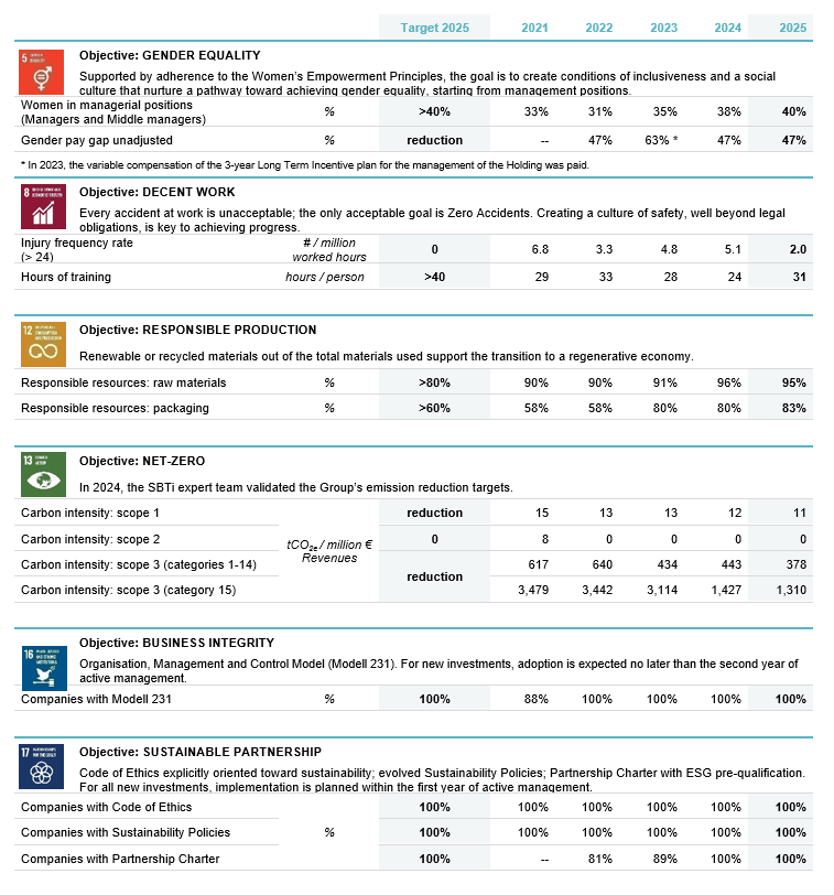 Italmobiliare adheres to the United Nations Global Compact and actively contributes to the achievement of the United Nations Sustainable Development Goals (SDGs). Among these goals, six have been set as common strategic references for value creation, integrated with specific targets for the business sectors of the portfolio companies. The table below provides an account of the key performances and progress made by Italmobiliare in these six areas over the last five years.
